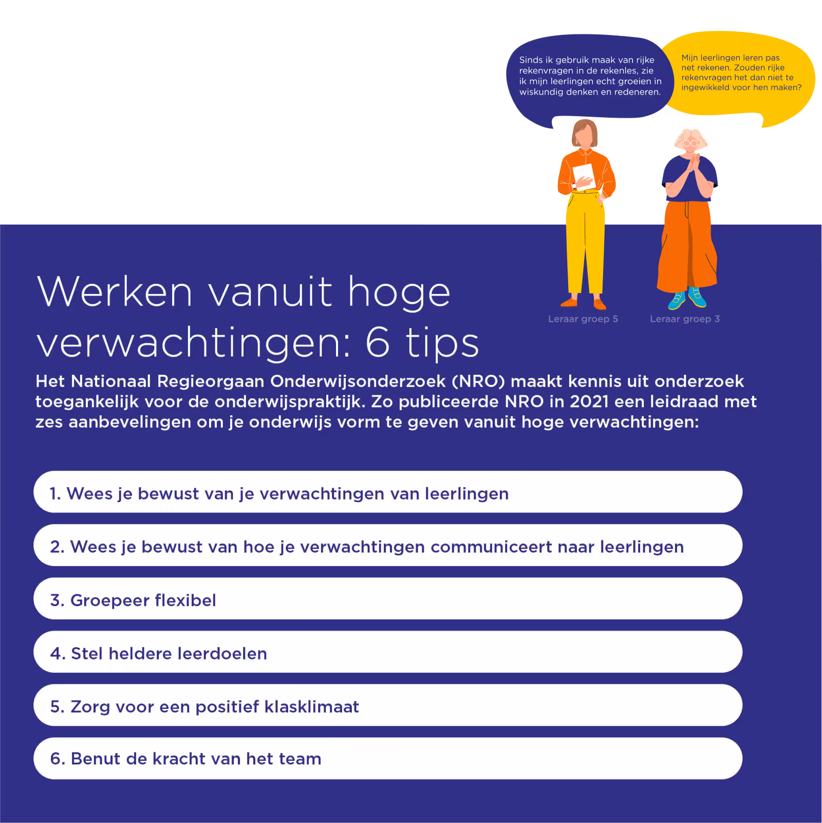 De school vond inspiratie in inzichten uit de wetenschap over het belang van hoge verwachtingen. Het Nationaal Regieorgaan (NRO) publiceerde hierover in 2021 een leidraad met zes aanbevelingen, die SLO onlangs vertaalde naar praktische handvatten voor het reken- en wiskundeonderwijs. Deze starten telkens vanuit een herkenbare praktijksituatie. “Bijvoorbeeld dat je als leraar onbewust ervan uitgaat dat leerlingen met een andere thuistaal minder goed mee kunnen komen”, vertelt Jaccoline Klein, curriculumontwikkelaar rekenen en wiskunde bij SLO.